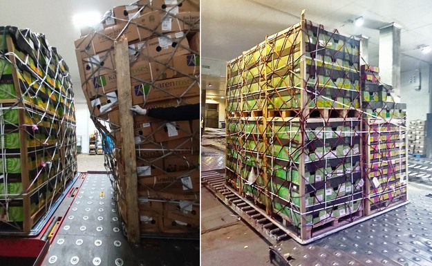 Op de foto's links: dozen verpakt met Innovent. Rechts: traditionele verpakking met hoeklatten en plastic banden.