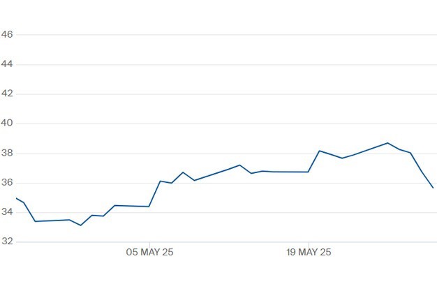 De TTF-gasprijs voor het contract 'winter 2025' t/m 30 mei. Klik hier voor de actuele gascontractprijzen.