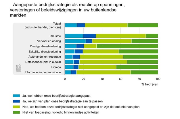 Bedrijven in de industrie (33 procent) en de vervoer en opslag (30 procent) gaven het vaakst aan hun bedrijfsstrategie aangepast te hebben of dat van plan te zijn vanwege ontwikkelingen in hun buitenlandse markten. Binnen de industrie zijn bedrijven in de transportmiddelenindustrie (46 procent), de elektrotechnische en machine-industrie (45 procent) en de metaalindustrie (36 procent) hier het vaakst mee bezig.