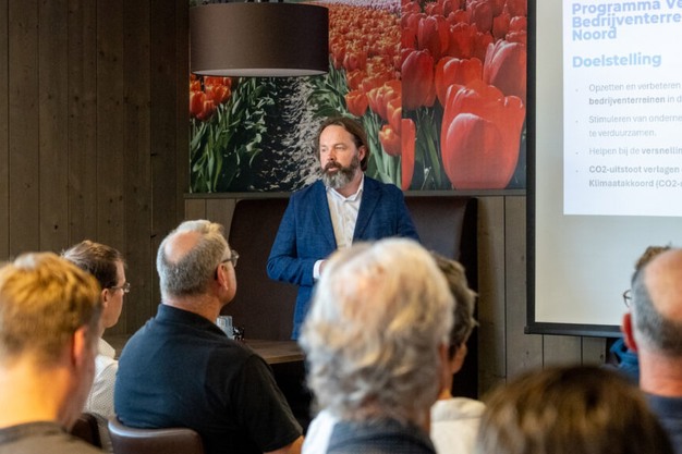 Robin Bäcker van Ontwikkelingsbedrijf Noord-Holland Noord (ONHN) lichtte toe hoe samenwerking tussen bedrijven op bedrijventerreinen versterkt kan worden via het nationale programma waaraan ONHN meewerkt. Eén van de mogelijkheden is het gezamenlijk opwekken, opslaan en uitwisselen van energie binnen zogeheten energiehubs. Dit verlaagt de druk op het net én versterkt de onderlinge samenwerking en veerkracht van bedrijven.