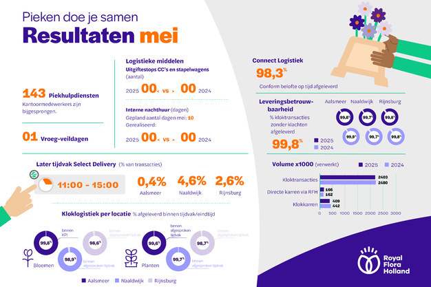 Na de echte piekmaand april heeft Royal FloraHolland in de maand mei nog meer bloemen en planten in de eigen logistiek verwerkt. Ondanks de hoge aantallen was de leverbetrouwbaarheid hoog en waren er nagenoeg geen klokstoringen.