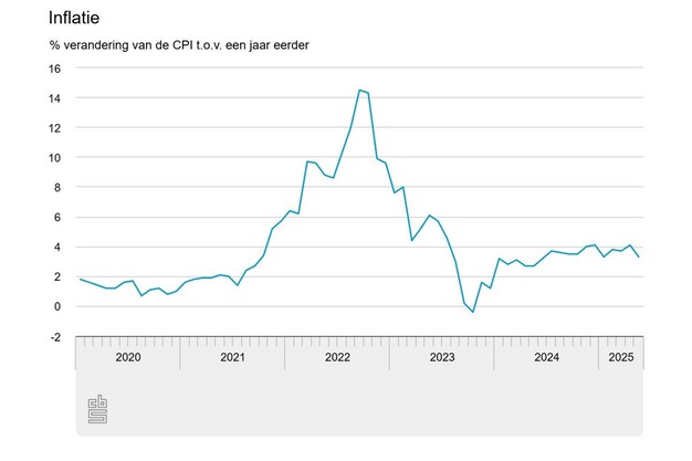 Bij de snelle raming was de inflatie in mei 3,3 procent, meldt het CBS. Deze raming is berekend op basis van nog onvolledige brongegevens. In april was de inflatie 4,1 procent.