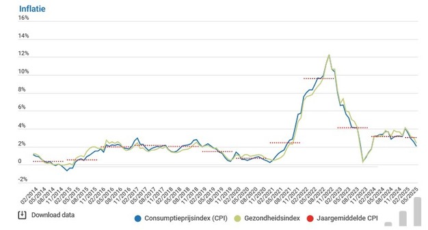 In mei daalt de Belgische inflatie van 2,55% naar 2,01%. De consumptieprijsindex daalt deze maand met 0,21 punt of met 0,16%. De inflatie op basis van de gezondheidsindex daalt van 3,00% naar 2,37%. De kerninflatie, die geen rekening houdt met de prijsevolutie van de energieproducten en de onbewerkte voedingsmiddelen, bedraagt 2,59% in mei, tegenover 2,82% in april.
