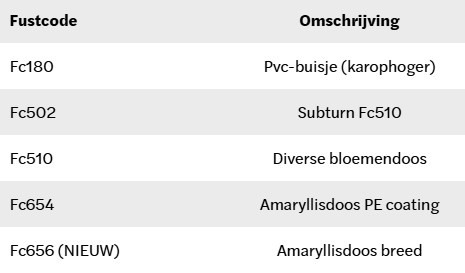 In overleg met de FPC Amaryllis en diverse gebruikers heeft Royal FloraHolland besloten de Fc510 na het Amaryllisseizoen 2025/2026 definitief uit het assortiment te nemen. Er zijn diverse verpakkingen in het assortiment die klanten als alternatief kunnen gebruiken.