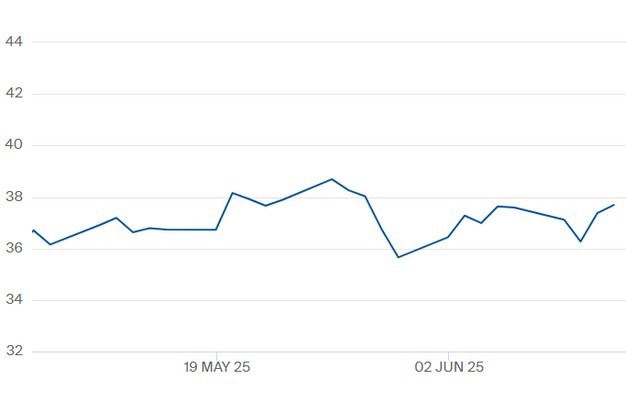 De TTF-gasprijs voor het contract 'winter 2025' t/m 12 juni. Klik hier voor de actuele gascontractprijzen.