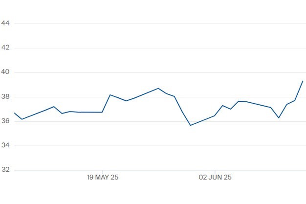 De TTF-gasprijs voor het contract 'winter 2025' t/m 13 juni. Klik hier voor de actuele gascontractprijzen.