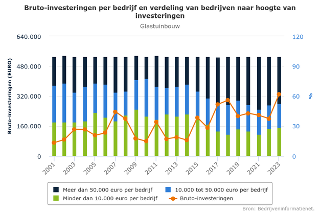 De spreiding binnen de sector bleef groot: in 2023 investeerde bijna de helft van de bedrijven meer dan 50.000 euro terwijl bijna 30% van de bedrijven minder dan 10.000 euro investeerde. Binnen de sector glastuinbouw was in 2023 het investeringsniveau het hoogst op de pot- en perkplantenbedrijven met gemiddeld ruim 550.000 euro.
