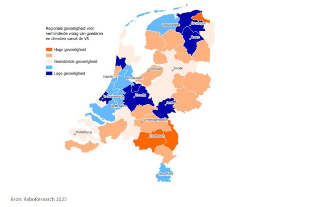 Ook Zeeuws-Vlaanderen (chemische industrie), Noordoost-Noord-Brabant (omgeving Den Bosch; diverse industrie) en IJmond (metaalindustrie) zijn relatief gevoelig voor vraagvermindering vanuit de VS. Daarentegen zijn Utrecht, Overig Groningen, Noord-Drenthe, Arnhem-Nijmegen, Den Haag, en Alkmaar en omgeving juist minder gevoelig voor een terugval in Amerikaanse vraag. Dit komt door de sectoren die in deze regio zijn oververtegenwoordigd, zoals de zorg, overheid en onderwijs. Deze sectoren zijn minder gevoelig voor internationale handelsontwikkelingen doordat ze vooral gericht zijn op lokale vraag en minder conjunctuurgevoelig zijn.