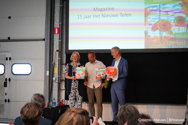 Welke innovaties en ervaringen heeft vijftien jaar Het Nieuwe Telen opgeleverd? Je leest het in het magazine '15 Jaar Het Nieuwe Telen'. Voorzitter Adri Bom-Lemstra van Glastuinbouw Nederland en Marten van den Berg, directeur-generaal Agro van het ministerie van LVVN ontvingen een eerste (dummy-)exemplaar van het blad, uit handen van Robert Solleveld, themaspecialist Energie bij Glastuinbouw Nederland. Dat gebeurde tijdens het EnergiekEvent op 18 juni bij WUR Glastuinbouw in Bleiswijk. Aan de productie van het magazine wordt nog volop gewerkt. Het blad zal na de zomervakantie verspreid worden onder telers en de businessleden van Glastuinbouw Nederland.