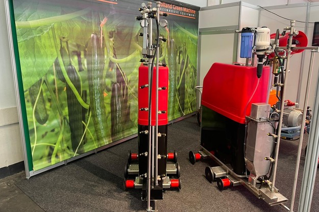 Tholen - Eric Gerritsma en Andrei de Bruin, Holland Green Machine: "Onze Wanjet spuitrobot werkt al 20 jaar met een enkele vaste spuitboom die de nozzles aan één kant heeft. Daarmee spuiten we aan de ene kant op de heenweg in het gewas, aan het einde draait de spuitboom 180 graden om zijn as, zodat de andere kant van het pad wordt bespoten als we weer terugrijden. Deze manier van gewas spuiten kost iets meer tijd, maar een belangrijke meerwaarde is dat aan de gevel met een extra draaiing van de spuitboom meer middel kan worden afgegeven op deze moeilijk bereikbare plek."