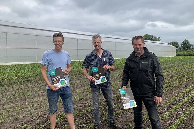 Pilotleider Arno Engels heeft de eerste exemplaren van de leidraad 'Weerbaar en nagenoeg emissieloos kweken in de praktijk' uitgereikt aan Ruben Gommers (links) en Maarten van Overbeek (rechts) tijdens de Techniekdag Boomteelt 2025, afgelopen donderdag bij Boomkwekerij Dams en Boomkwekerij Jos Willemsen en Zoon in Zundert.
