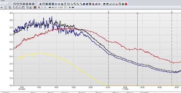 Hidde Preidel van RedStar laat zien hoe planten zelf zorgen dat het koeler is in de kas. Ook hier data van maandag. Terwijl de buitentemperatuur aan het eind van de dag verder toe neemt, ziet hij in klimaatdata dat vanaf 16:00 uur en richting de nacht de planttemperatuur afneemt en onder de buitentemperatuur zakt. "Dit koelende effect (door verdamping) zorgt ervoor dat het kasklimaat herstelt in vocht. Zeker door aan het einde van de dag te knijpen met de ramen. Hierdoor zakt de kastemperatuur uiteindelijk tot 4 graden onder de buitentemperatuur! Een indrukwekkende koelcapaciteit van de planten."