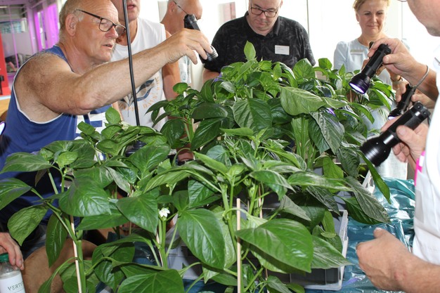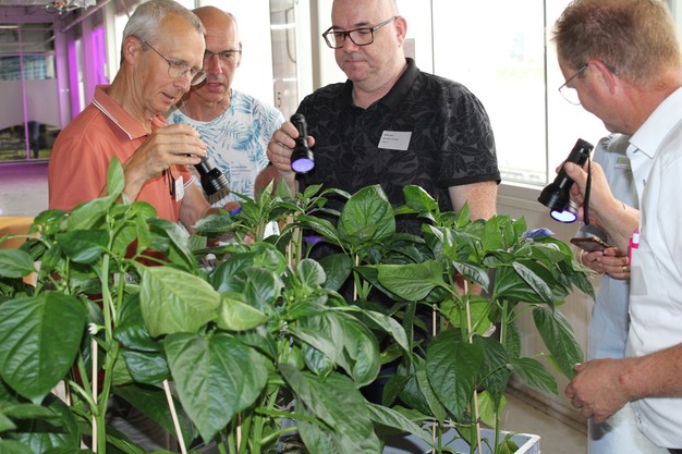 En om het ook meteen maar praktisch toe te lichten, had Caroline planten en lampjes klaargezet. De aanwezigen konden precies zien hoe een middel verspreid werd over het gewas na bespuitingen.