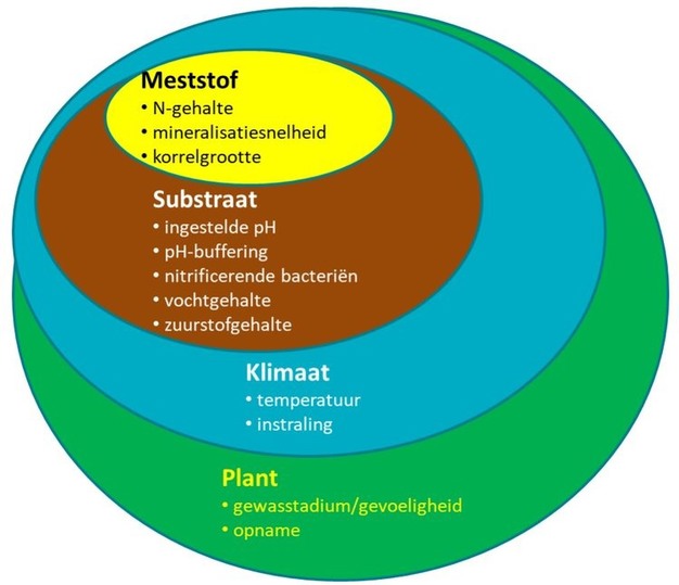Organische meststoffen gedragen zich in een substraat anders dan minerale varianten. Ook is de werking in substraten niet te vergelijken met volle grond. Factoren die een rol kunnen spelen zijn: de activiteit van bacteriën nodig voor stikstofmineralisatie, de veranderende pH-waarde in combinatie met de pH-buffer van het substraat en het mogelijk ontstaan van een hoog ammoniakgehalte in het substraat. Ook de mineralisatiesnelheid van stikstof uit organische meststoffen varieert en is, door diverse factoren, minder voorspelbaar.