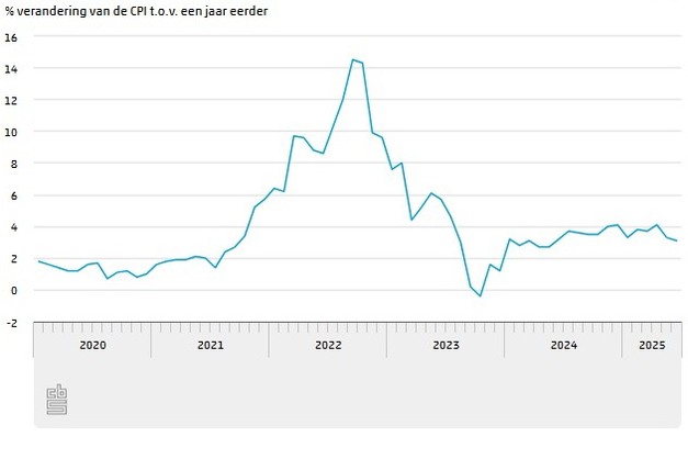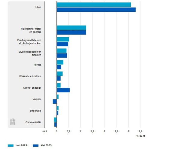 In juni 2025 waren consumentengoederen en -diensten 3,1 procent duurder dan een jaar eerder, meldt het CBS. In mei was de inflatie 3,3 procent. Het inflatiecijfer van juni is hetzelfde als bij de snelle raming die op 1 juli is gepubliceerd.