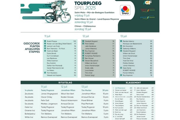 Roelof Poppe van Koornstra, Diederik Bogaert van Vergro en voor de tweede keer Renske Adema en Monique van Beerendonk hebben de dagzeges gepakt dit weekend in het Takii Tourploegspel. Luit Mazereeuw is terug aan kop, na een weekend met twee sprintetappes en op vrijdag een sprint heuvelop.