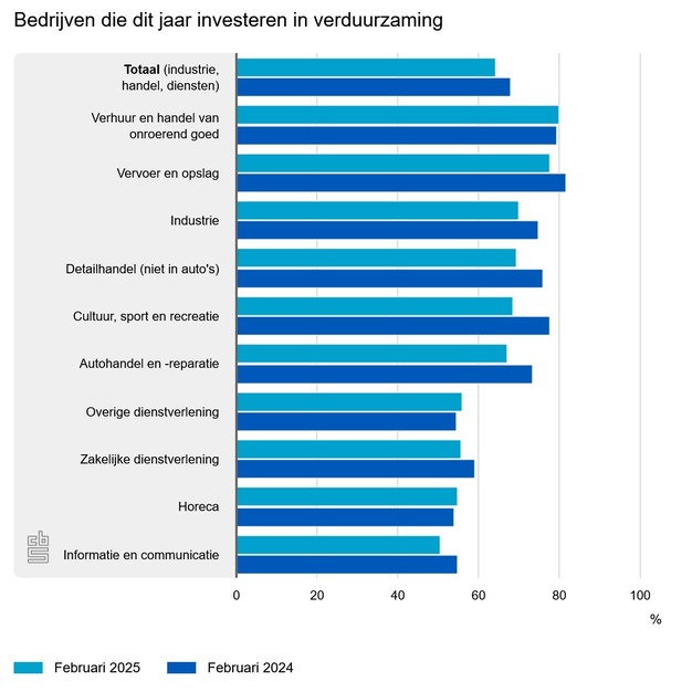 In 2023 namen bedrijven 64 procent van klimaatgerelateerde investeringen voor hun rekening. Tussen 2019 en 2023 zijn deze investeringen bijna verdubbeld. Desondanks was het aandeel bedrijven dat aangaf te investeren in verduurzaming begin 2025 lager dan een jaar eerder, in bijna alle bedrijfstakken. In dienstverlenende sectoren zoals de informatie en communicatie en de horeca doen bedrijven het vaakst geen investeringen voor verduurzaming.