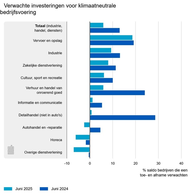 Van de bedrijven die investeren in verduurzaming, verwachtten er in juni meer dat het bedrag zou toenemen dan afnemen. Het saldo ligt met 6 procent wel lager dan een jaar eerder (13 procent). Vooral in de detailhandel en de verhuur en handel van onroerend goed zijn de verwachtingen hierover sterk gedaald. In de autohandel en -reparatie, de horeca, en de overige dienstverlening verwachtten ondernemers per saldo een afname van hun investeringen voor het verduurzamen van hun bedrijfsvoering.