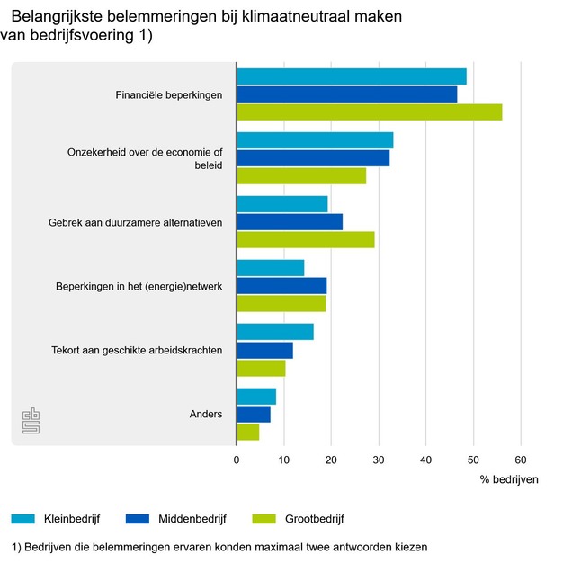 Van de bedrijven die belemmeringen ervaren, noemde meer dan de helft financiële beperkingen als belangrijkste belemmering. Dit kunnen hogere kosten van duurzame alternatieven of beperkte toegang tot financiële middelen zijn. Daarnaast is onzekerheid over de economie of beleid voor 31 procent van deze bedrijven een belangrijke belemmering. Dit speelt bij kleinere bedrijven iets vaker dan bij grotere bedrijven. Gebrek aan duurzame alternatieven is volgens grote bedrijven juist relatief vaker de belangrijkste belemmering. Beperkingen in het (energie)netwerk en tekort aan geschikte arbeidskrachten zijn met respectievelijk 18 en 13 procent minder vaak de belangrijkste belemmering voor bedrijven.