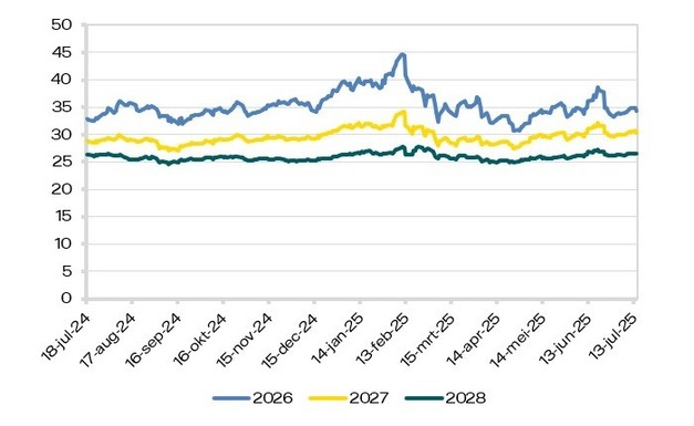 Prijsbeweging TTF-futures afgelopen jaar, beeld uit marktupdate Vattenfall