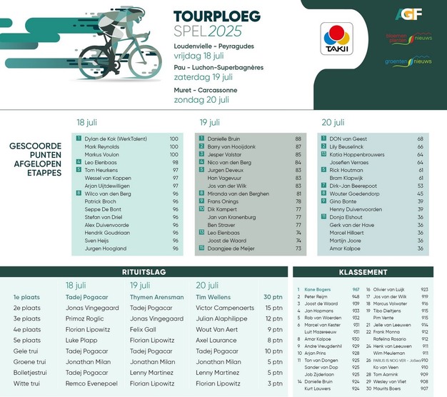 In het Takii Tourploegspel pakten Dylan de Kok (WerkTalent), Mark Reynolds (Dalsem), Markus Voulon (Amevo), Daniëlle Bruin (Bejo) en Don van Geest de dagzeges. Kane Bogers (APB Holland) gaat met de virtuele gele trui om zijn schouders de rustdag in.