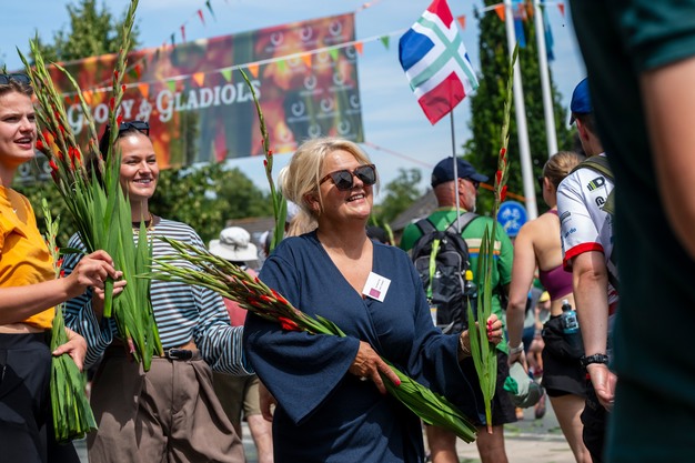 Tholen - Tijdens de slotdag van de Nijmeegse Vierdaagse zijn in Molenhoek ruim 15.000 gladiolen uitgedeeld aan wandelaars. De bloemen – die symbool staan voor kracht en overwinning – werden aangeboden aan alle 40 en 50 kilometer-lopers door de kwekers van VIGO Gladiolus, in samenwerking met hun relaties.