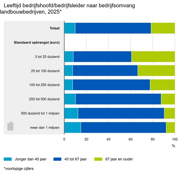 Grote bedrijven met een Standaard Opbrengst (SO) van 500 duizend euro of meer hebben relatief vaker een jong bedrijfshoofd of bedrijfsleider. In 2025 zijn er bijna 15 duizend landbouwbedrijven met een SO van 500 duizend euro of meer. Bij 14 procent van deze bedrijven staat een boer jonger dan 40 jaar aan het roer. Met bijna 9 procent is het aandeel boeren van 67 jaar of ouder in deze omvangsklasse het kleinst.