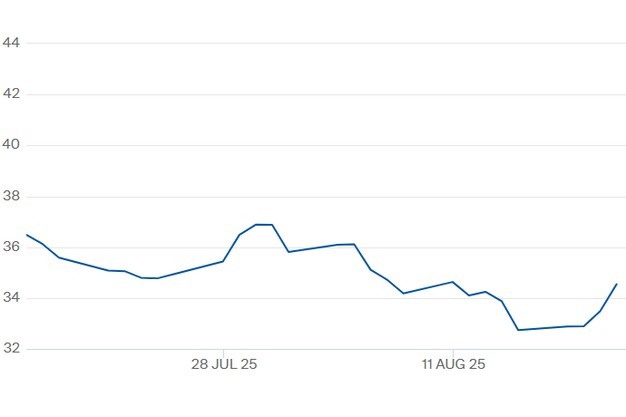 De TTF-gasprijs voor het contract Q1 2026 t/m 21 augustus. Klik hier voor de actuele gascontractprijzen.