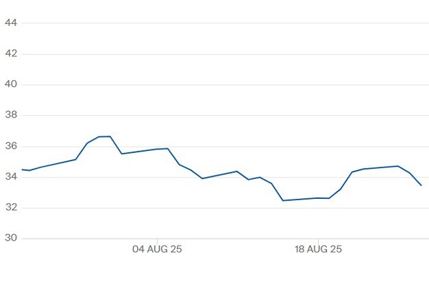 De TTF-gasprijs voor het contract Q1 2026 t/m 27 augustus. Klik hier voor de actuele gascontractprijzen.