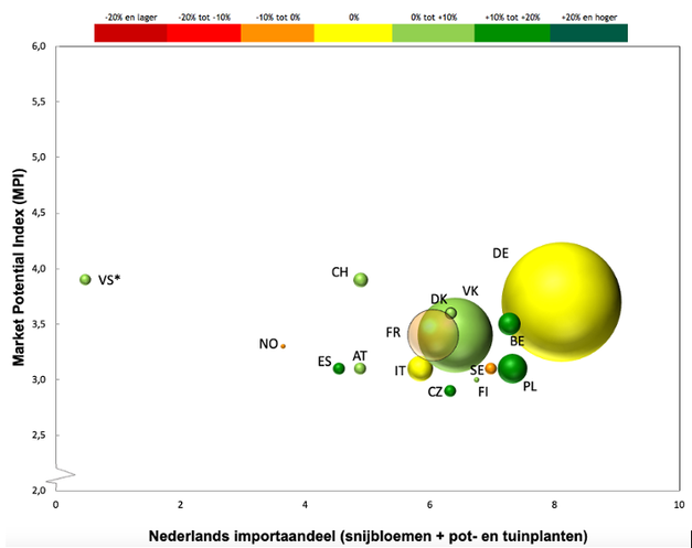 Floridata heeft deze ontwikkeling van de Nederlandse exportpositie in combinatie met de handelsmogelijkheden per land in kaart gebracht door een MABA-Analyse uit te voeren. Dat staat voor Market Attractiveness Business position Assessment. Het resultaat is een 'Marktpotentie-Exportpositie' matrix.