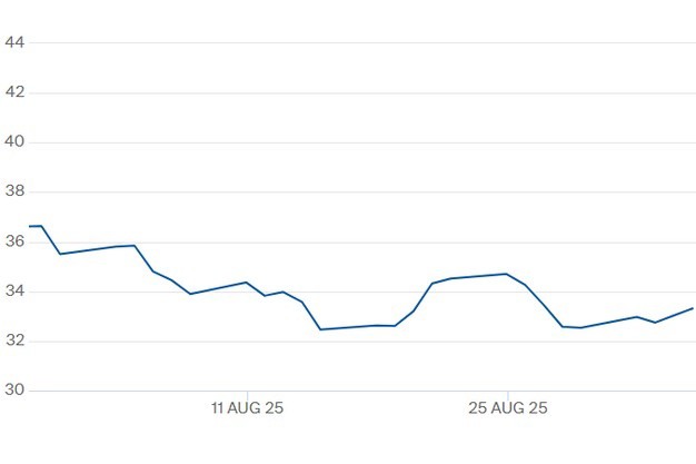 © ICEDe TTF-gasprijs voor het contract Q1 2026 t/m 4 september. Klik hier voor de actuele gascontractprijzen.