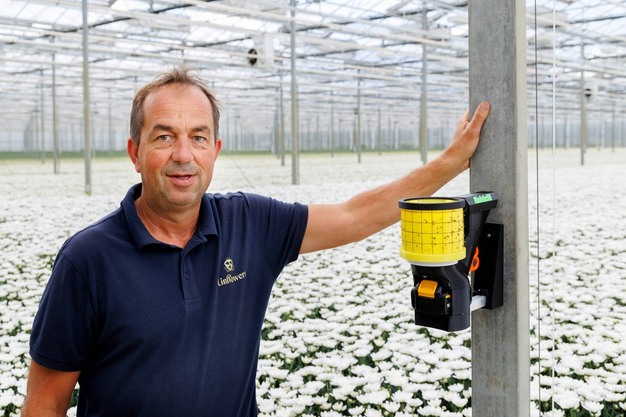 Aan het woord is David van Tuijl van chrysantenkwekerij Linflowers in Brakel. Op de kwekerij van 3,7 hectare draaien sinds een paar weken 15 Robcams. David van Tuijl: "Ze hangen in vijf rijen van drie exemplaren over de kas verdeeld. Elke Robcam maakt dagelijks 150 foto's, die ze via wifi volautomatisch verstuurd, waar ze met AI worden gescand op insecten. Zo maken wij handig gebruik van digitaal scouten. Voorheen maakten we 1 keer per week een scoutronde op vliegende insecten."
