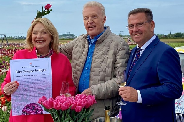 Culinair specialist en tv-persoonlijkheid Janny van der Heijden is verrast met een eigen roze tulp. Dat was op zondagavond 28 september jl. te zien in de eerste aflevering van het nieuwe seizoen van Denkend aan Holland.