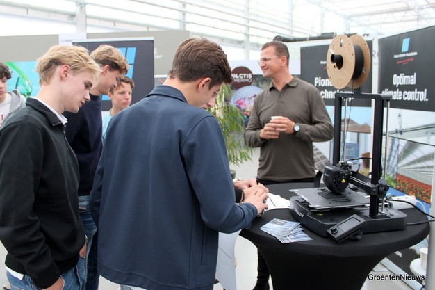 Bij Peter Dekker Installaties springt een 3D-printer in het oog. Eromheen verzamelen zich al snel veel studenten, want ook die zijn goed vertegenwoordigd. Voor nieuw talent is altijd plek in Naaldwijk, horen we van de engineer die samen met zijn collega, die uitvoerder is, de stand bemant. Hier geen HR-medewerker dus.