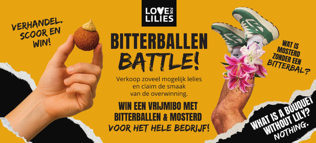 Love for Lilies staat bekend om campagnes met een knipoog. Eerder zorgde de succesvolle Valentijnsactie bij exporteurs en handelaren voor extra zichtbaarheid van de Lelie+ boeketten. Met de 'Bitterballen Battle' krijgt die boodschap een stoer vervolg, met meer competitie, meer plezier en meer lelies.