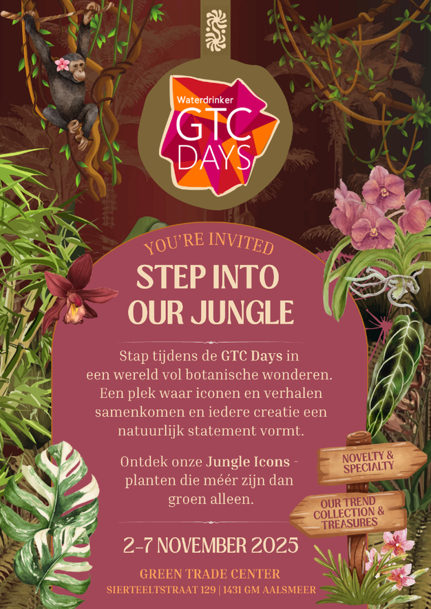 Van zondag 2 t/m vrijdag 7 november vinden de GTC Days bij Waterdrinker plaats: zes inkoop- en inspiratiedagen. Tijdens deze editie staan de 'Jungle Icons' centraal: planten die méér zijn dan alleen groen. De GTC Days hebben een aantrekkingskracht op bloemisten, tuincentra, groothandelaren en retailers uit heel Europa. De beursdagen bieden een uitgelezen kans om nieuwe trends te ontdekken en de meest exclusieve planten, bloemen en accessoires in te slaan.