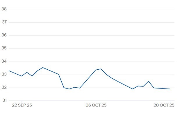 De TTF-gasprijs voor het contract Q1 2026 t/m 20 oktober. Klik hier voor de actuele gascontractprijzen.