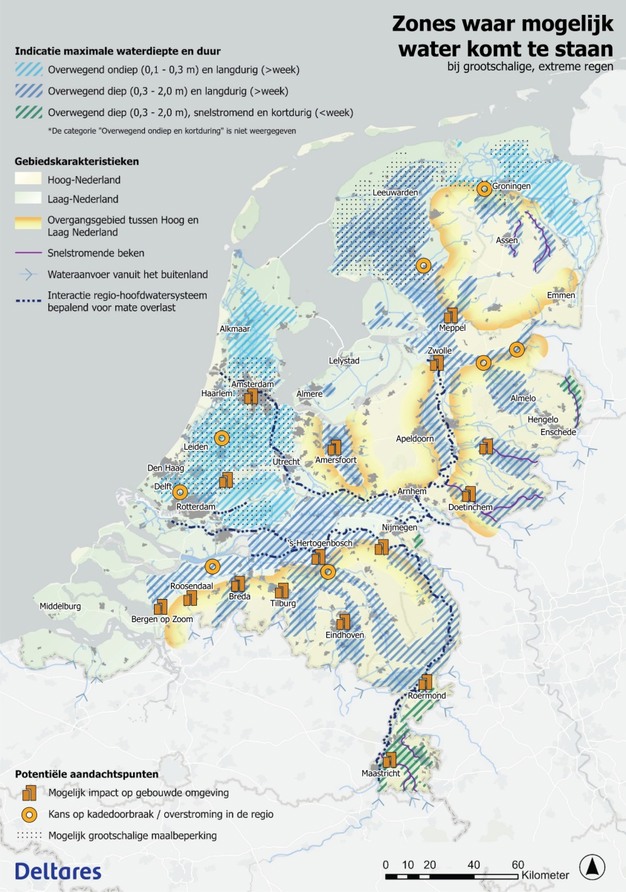 De wateroverlast in Limburg in 2021 liet zien dat Nederland zich beter moet voorbereiden op grootschalige extreme regen. Daarom heeft Deltares, in opdracht van het ministerie van Infrastructuur en Waterstaat, een landelijk waterbeeld opgesteld: wat als deze extreme hoeveelheid regen, van 200 mm in 48 uur gelijktijdig over een groot gebied, over de andere provincies zou vallen? In sommige gebieden kan het water meerdere weken blijven staan en op andere plekken lokaal meer dan een meter diep worden.