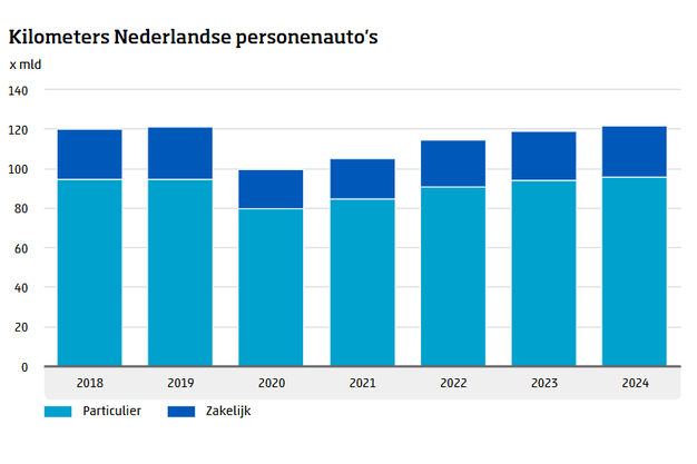In 2024 reden Nederlandse personenauto's bijna 122 miljard kilometer, 2,3 procent meer dan in 2023 en voor het eerst meer dan in 2019, voor de coronapandemie. Dit meldt het Centraal Bureau voor de Statistiek (CBS) op basis van nieuw onderzoek naar voertuigkilometers.