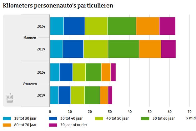 Nederlandse auto's reden in totaal 726 miljoen kilometer meer dan voor de pandemie (+0,6 procent). Het gemiddelde per auto lag echter 5,7 procent lager dan in 2019. "Dat de totale kilometers toch toenemen komt doordat er meer auto's zijn", aldus het CBS. In 2024 waren 9,9 miljoen personenauto's in gebruik, tegenover 9,3 miljoen in 2019.