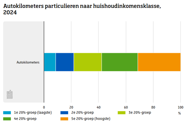 Huishoudens uit de hogere inkomensgroepen hebben vaker een auto en rijden meer kilometers dan lagere inkomensgroepen. In 2024 werd 31,3 procent van alle autokilometers gereden met auto's van huishoudens uit de 20 procent hoogste inkomens. Auto's van huishoudens uit de laagste 20 procent waren goed voor 8,8 procent van de kilometers.