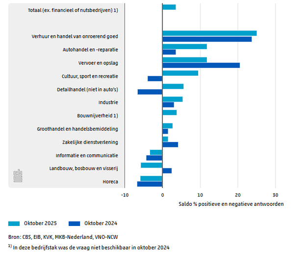 Per saldo verwacht ruim 3 procent van de ondernemers meer te investeren in 2026. Ondernemers in de vastgoedsector verwachten dit met per saldo 25 procent het vaakst. Negen bedrijfstakken verwachten meer te investeren, de overige drie bedrijfstakken verwachten minder te investeren. In de cultuur, sport en recreatie en in de detailhandel verwachten ondernemers meer te investeren, terwijl ze vorig jaar nog een afname verwachtten. In de landbouw, bosbouw en visserij, in de horeca en de informatie en communicatie, verwachten ondernemers dat ze minder gaan investeren in 2026.