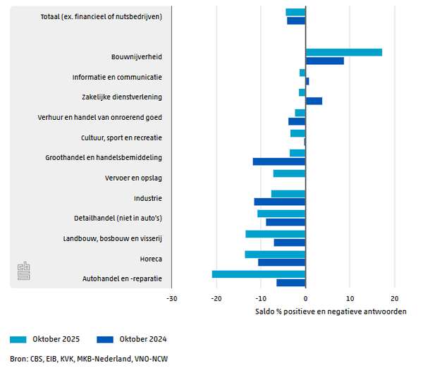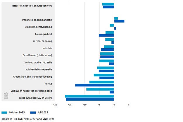 Aan het begin van het vierde kwartaal 2025 gaven meer ondernemers aan dat hun winstgevendheid is afgenomen dan toegenomen in het afgelopen kwartaal; het saldo was daarmee negatief. In acht van de twaalf bedrijfstakken zijn ondernemers negatiever over de winstgevendheid. Doordat ondernemers in de bouwnijverheid positiever zijn over hun winstgevendheid, is het totaalcijfer vrijwel hetzelfde als vorig jaar. Verder waren alleen in de groothandel, de industrie en de vastgoedsector ondernemers minder negatief dan een jaar geleden. In de autohandel en -reparatie waren ondernemers met een saldo van -21 procent het negatiefst over de ontwikkeling van hun winstgevendheid.