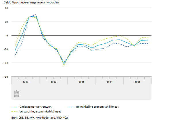 Het ondernemersvertrouwen komt in het vierde kwartaal van 2025 uit op -4,0 en blijft daarmee vrijwel gelijk ten opzichte van een kwartaal eerder. Ondernemers waren negatiever over het economisch klimaat in het afgelopen kwartaal, dan over hun verwachtingen voor het komende kwartaal. Het ondernemersvertrouwen is sinds begin 2022 onafgebroken negatief en ligt op het gemiddelde (-4,0) vanaf 2012.