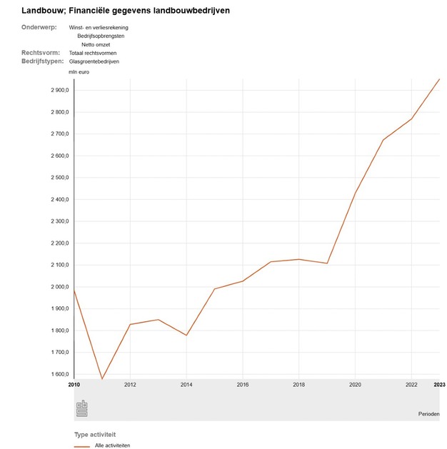 De netto-omzet van glasgroentenbedrijven in Nederland in 2023 bedroeg 2951,7 miljoen euro. De totale bedrijfskosten stegen ook, tot 2780,3 miljoen euro. In totaal telt het CBS in 2023 754 bedrijven. Gemiddeld levert dat een netto-omzet per bedrijf op van 3,91 miljoen euro, zo blijkt uit definitieve CBS-cijfers voor 2023.