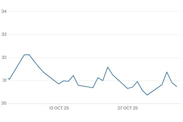 De TTF-gasprijs voor het contract Cal 2026 t/m 6 november. Klik hier voor de actuele gascontractprijzen.