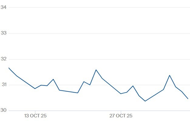 De TTF-gasprijs voor het contract Cal 2026 t/m 7 november. Klik hier voor de actuele gascontractprijzen.