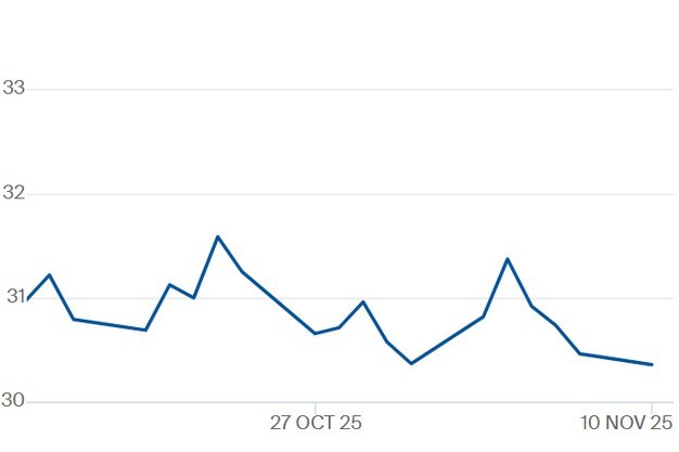 De TTF-gasprijs voor het contract Cal 2026 t/m 10 november. Klik hier voor de actuele gascontractprijzen.