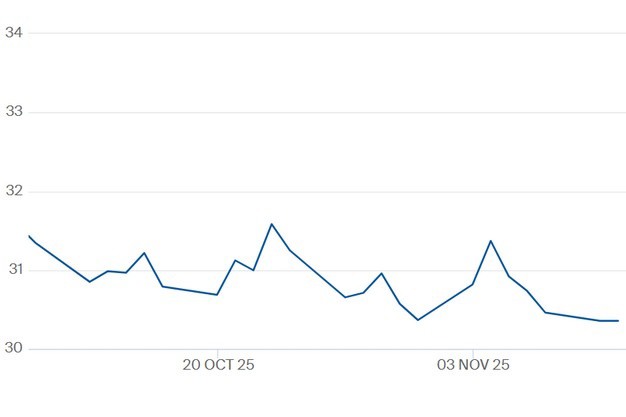 De TTF-gasprijs voor het contract Cal 2026 t/m 11 november. Klik hier voor de actuele gascontractprijzen.
