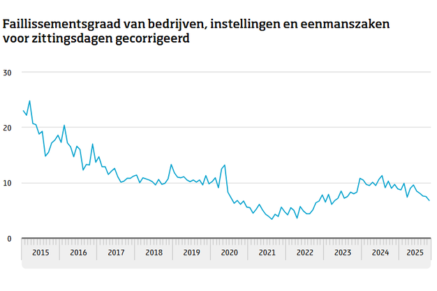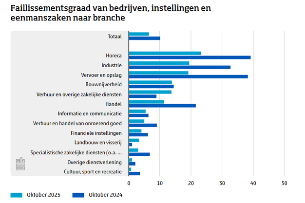 Niet alle sectoren laten hetzelfde beeld zien. De horeca had in oktober relatief de meeste faillissementen, met 23,3 per 100 duizend bedrijven. Vorig jaar waren dat er nog 39,3. Ook andere sectoren lieten een daling zien, wat wijst op een bredere verbetering in het bedrijfsleven.